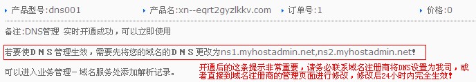 5、開通后系統(tǒng)會提示您將域名的DNS服務器地址修改為我司,修改后會在24小時內(nèi)完全生效。
