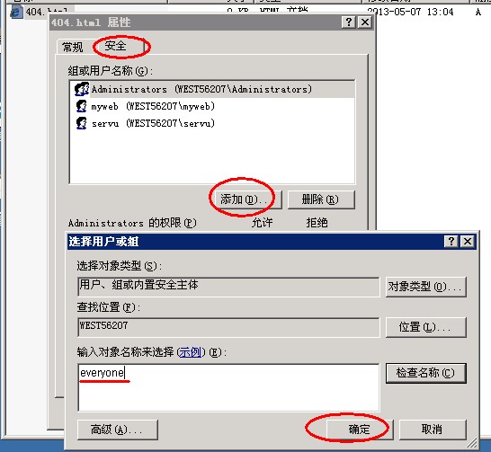消息類型選擇“文件”,指定網(wǎng)站目錄下的404文件。 然后給404文件everyone可讀權(quán)限,右鍵404文件--屬性--安全,添加everyone可讀,如圖所示: