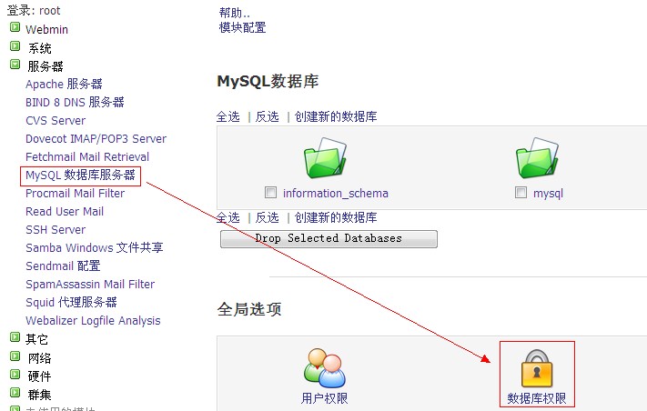 f、點擊“服務器”—“mysql數據庫服務器”—“數據庫權限”,如圖: