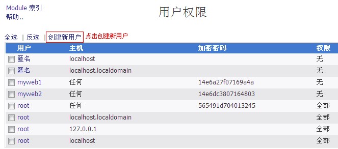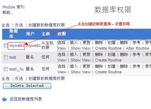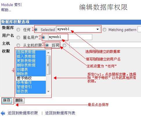 h、選擇您的數據庫、填寫剛才建立好的用戶名,主機選擇“任何”,最后按住Ctrl鍵,鼠標選中除了“授予特權”以外的所有權限,最后點保存。如圖: