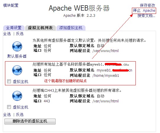 c、設置完成后,點擊右上角的停止Apache,然后點擊啟動Apache,完成httpd服務的重啟,如圖: