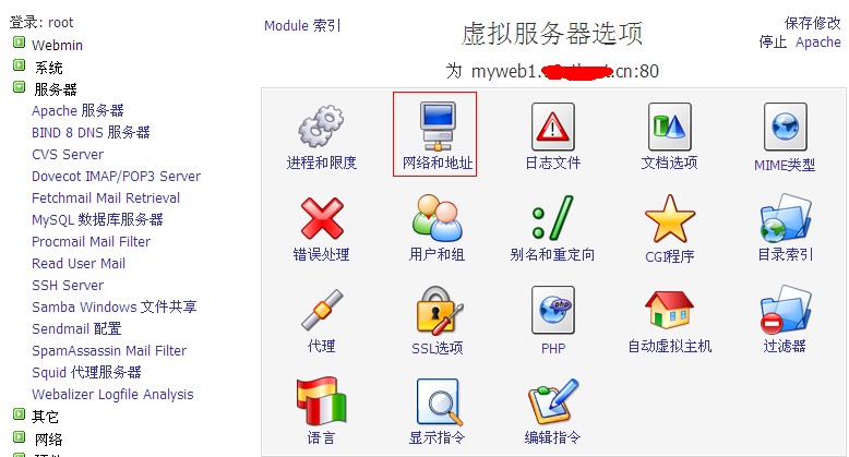 d、 如果有多個域名需要綁定,請點擊“虛報主機列表”選擇您的虛擬主機,進入虛擬主機服務器選項,點擊“網絡和地址”如圖: