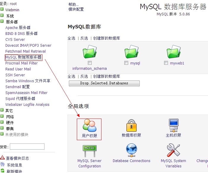 c、點擊“服務器”—“mysql數據庫服務器”—“用戶權限”,如圖: