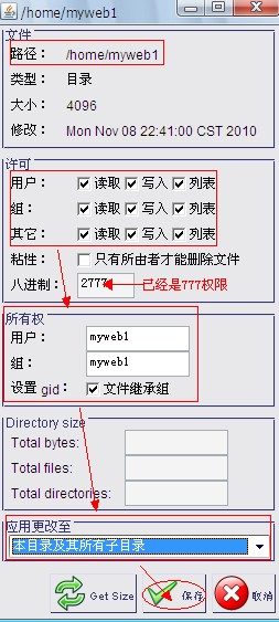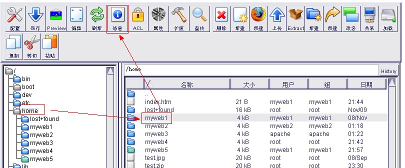 四、為文件或文件夾附加權(quán)限。 1、登錄webmin,點擊“其他”--“文件管理器”,選擇對應的文件或文件夾,然后點擊信息按鈕。如圖: 2、在信息窗口中,查看路徑是否正確,別將權(quán)限附加到其他位置,然后在許可中設(shè)置用戶、組、其他的權(quán)限,在所有權(quán)中設(shè)置 用戶和組名,應用更改至,一般選擇“本目錄及其所有子目錄”,這樣可以附加權(quán)限和所有者到每一個文件。如圖:
