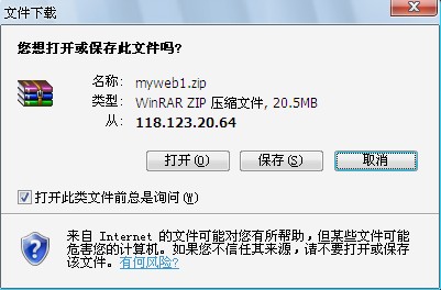 3、選擇文件格式后,頁面上會進入假死狀態(tài),實際上是服務(wù)器端在壓縮文件,不要做其他的操作,壓縮完成后 會彈出下載提示框,點擊保存即可下載到本地。如圖: 以上就是一些常用到的功能說明,太大的文件上傳,建議使用FTP,上傳后采用文件管理器的解壓功能進行解壓,然后設(shè)置權(quán)限, 并移動到正確的路徑下。