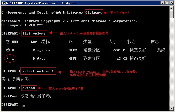 依次輸入以下命令: diskpart 回車 操作流程如圖(紅色方框中是輸入的命令) 注意:以實際要合并的盤符對應的卷號為準。