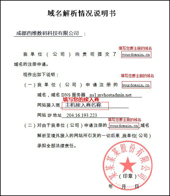 填寫時(shí),僅需要將“yourdomain.cn”替換為您需要注冊(cè)的域名即可,其他地方不做修改,印章處需加蓋公司公章,如果是個(gè)人用戶注冊(cè),在印章處簽名即可,日期填寫申請(qǐng)注冊(cè)時(shí)的日期。填寫后將文檔在管理中心上傳即可(不再發(fā)到郵箱trans@west263.com) 。 申請(qǐng)后需要cnnic處理,一般需要3~5個(gè)工作日開通。 文檔下載地址:http://downinfo.myhostadmin.net/domainresolution.doc
