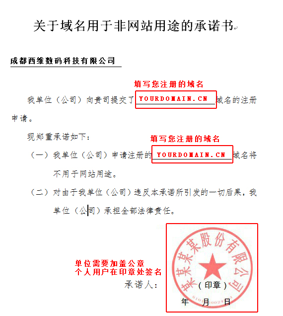 <<關(guān)于域名用于非網(wǎng)站用途的承諾書>> 應(yīng)上級(jí)主管單位要求,域名用于非網(wǎng)站用途 , 例如郵局等,對(duì)應(yīng)的域名不需進(jìn)行網(wǎng)站ICP備案掃描驗(yàn)證,也就是說如果您注冊(cè) .cn域名,不用于網(wǎng)站訪問,是可以不用備案的。但須填寫《域名用于非網(wǎng)站用途的承諾書》,填寫示例如下圖: