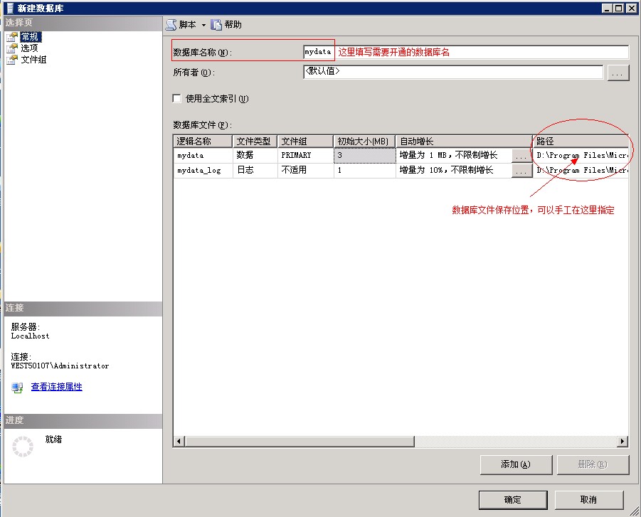 填寫數(shù)據(jù)庫名,如mydata,選擇數(shù)據(jù)庫保存路徑,一般可以保持默認(rèn)地址,點擊“確定”。