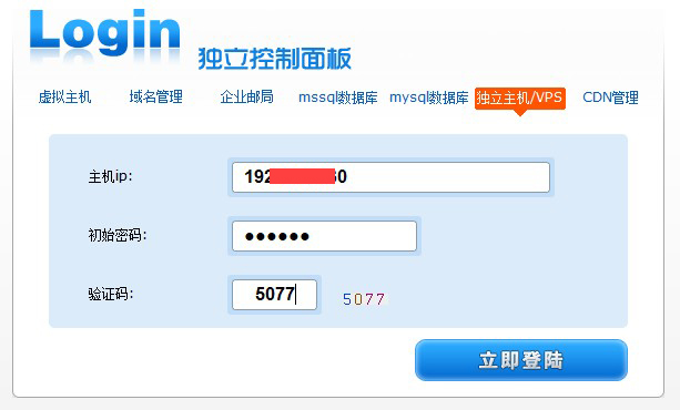 若您是從獨立控制面板登陸,其操作方法也是一致的。打開www.myhostadmin.net獨立控制面板,點擊“獨立主機/VPS”,輸入主機內(nèi)部地址(內(nèi)網(wǎng)IP)和服務(wù)器開通時的初始密碼登陸,登陸后根據(jù)上述提示進行解析操作。
