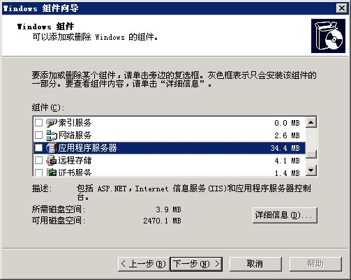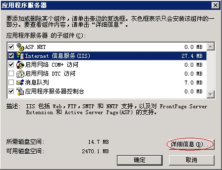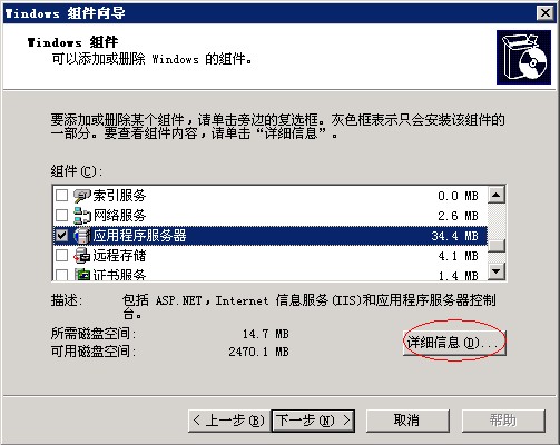 3、按照剛才的操作步驟,重新進(jìn)入“添加/刪除windows組件”,將“應(yīng)用程序服務(wù)器”打鉤,并點(diǎn)擊右下角“詳細(xì)信息”,如圖:
