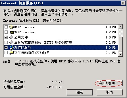 4、在“詳細(xì)信息”中,勾選“ASP.NET”,并選擇“Internet信息服務(wù)(IIS)”,點(diǎn)擊右下角的“詳細(xì)信息”,如圖: