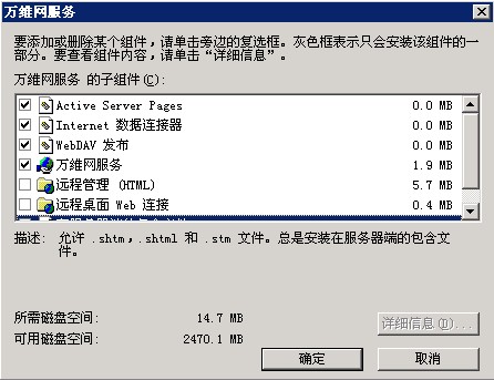 6、勾選“Active Server Pages”、“Internet 數(shù)據(jù)連接器”、“WebDAV 發(fā)布 ”、“在服務(wù)器端的包含文件”,然后一路點(diǎn)“確定”,最后點(diǎn)“下一步”開(kāi)始安裝,如圖: