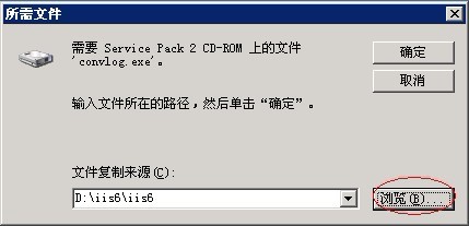 7、安裝時(shí)提示“需要Serveice Pack 2 CD-ROM 上的文件 'convlog.exe'”,點(diǎn)“瀏覽”指向到您的IIS6組件包的目錄,目錄中會(huì)顯示文件“Convlog.ex_”,然后按“確定”。提示需要其他文件時(shí),也按此操作,若您勾選了以上說(shuō)明以外的組件,可能因?yàn)榻M件包中未包含,導(dǎo)致安裝失敗。如圖: