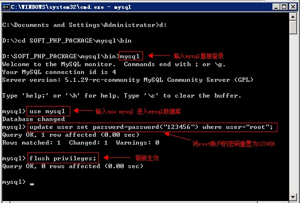 2、另外打開一個cmd窗口, 依次輸入以下命令,將root賬戶密碼重置為123456。(命令輸入部分用紅色標注)