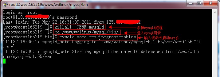 2、 使用`--skip-grant-tables' 參數來啟動 mysqld(/www/wdlinux/mysql/bin/為wdcp系統(tǒng)的mysql路徑,非此系統(tǒng)的,請變更mysql的路徑)