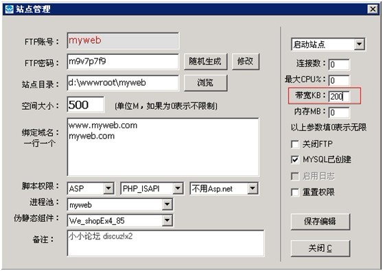 如果需要更詳細的統(tǒng)計,可以下載http://downinfo.myhostadmin.net/iis-Monitor.rar 軟件來統(tǒng)計。 通過總的web收發(fā)大小可以看出哪個站點的流量大,并進行整改。 流量異常處理方法: 查出某個站點太占用帶寬,可以在網(wǎng)站管理助手設置帶寬大小,如圖: