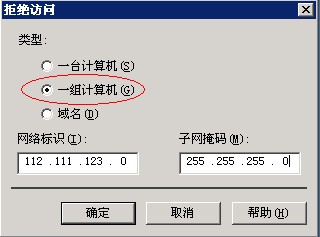 IP地址按照IPV4的標(biāo)準(zhǔn)來分,分為A類地址、B類地址、C類地址,一般我們是屏蔽C類或者B類地址。 A類地址:如 112.*.*.* 子網(wǎng)掩碼 255.0.0.0 B類地址:如 112.111.*.* 子網(wǎng)掩碼 255.255.0.0 C類地址:如 112.111.123.* 子網(wǎng)掩碼 255.255.255.0 如上,若屏蔽C類地址,只會屏蔽255個(gè)IP;若屏蔽B類地址,將會屏蔽255X255=65025個(gè)IP地址。如果需要屏蔽的是個(gè)固定IP,建議只屏蔽該IP,不確定是否為固定IP,建議屏蔽C類地址,因此屏蔽掉B類地址影響會比較大。 此處我們以屏蔽一個(gè)C類地址為例,我們要屏蔽112.111.123.*這段地址,類型選擇“一組計(jì)算機(jī)”,網(wǎng)絡(luò)標(biāo)識將*換成0,填寫112.111.123.0,子網(wǎng)掩碼 255.255.255.0,如圖: