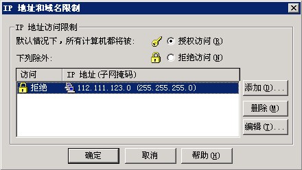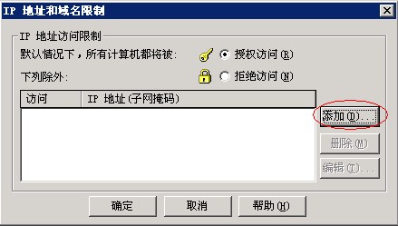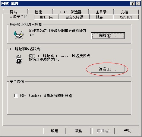 點(diǎn)擊“目錄安全性”,打開“IP地址和域名限制”的編輯,如圖: