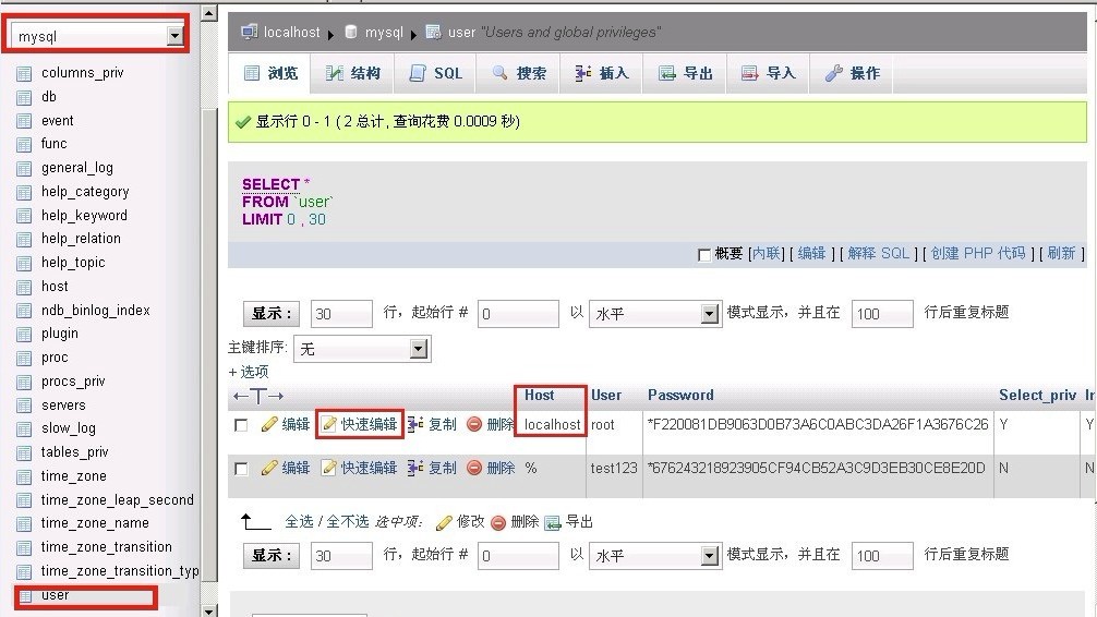 1、Windows系統(tǒng)主機(jī): 方法①、可以用phpmyadmin連接登陸mysql,選擇mysql數(shù)據(jù)庫(kù),打開user表,選擇您需要開啟遠(yuǎn)程連接的用戶,點(diǎn)快速編輯,將host列里面的值修改為%就可以完成。