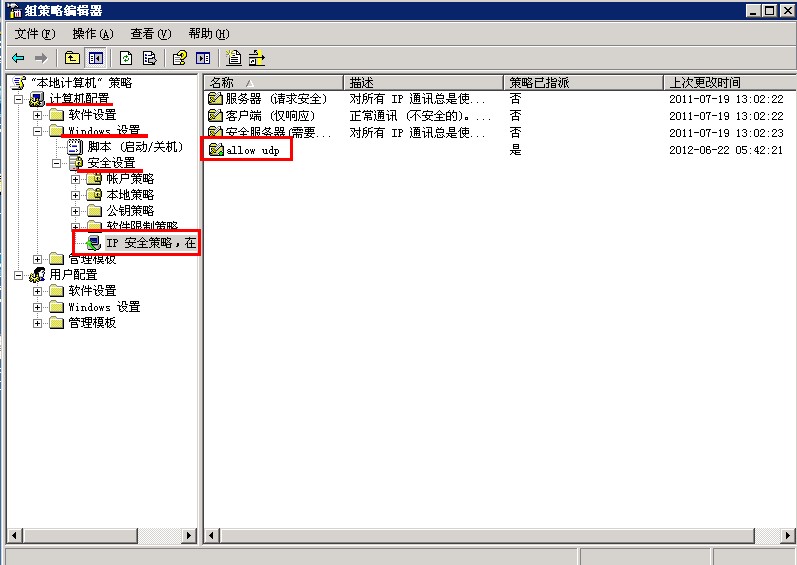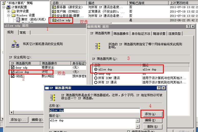 [原創(chuàng)]我司windows系統(tǒng)VPS、云主機、獨立服務(wù)器添加UDP端口默認情況下,如果安全組沒有攔截限制UDP,那么就是安全策略里面沒有放行,參考下面的操作步驟: 第一步:首先遠程登錄到服務(wù)器,遠程登錄請參考:http://m.ps-sw.cn/faq/list.asp?unid=417 登錄以后在運行里面輸入gpedit.msc回車,依次展開 計算機配置--windows設(shè)置--安全設(shè)置 打開IP安全策略,然后找到allow udp,如下圖所示: 第二步:依次雙擊allow udp 選擇許可的allow udp再進行雙線,然后選擇默認第一描述為allow udp的進行雙線,然后點擊添加,如圖所示: 點擊添加以后會提示下一步,點擊下一步后,描述里面填寫udp描述,示例以1111為例 然后點擊下一步,源地址選擇我的IP地址,目標地址選擇任何IP地址