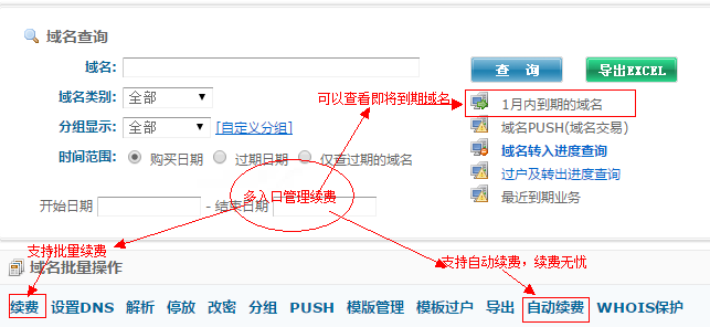 2、支持多種方式選擇域名續(xù)費(fèi): 在域名管理界面中,選擇【1個(gè)月內(nèi)到期的域名】-可以查看近期不同時(shí)間到期的域名以續(xù)費(fèi);選擇【域名批量操作-續(xù)費(fèi)】或【域名批量操作-自動(dòng)續(xù)費(fèi)】可以批量對(duì)多個(gè)域名續(xù)費(fèi)。