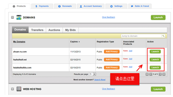 2、點(diǎn)擊Products標(biāo)簽中DOMINS前面的【+】,展開域名列表。 3、展開域名列表后,找到需要修改DNS的域名,點(diǎn)擊對(duì)應(yīng)的【Launch】按鈕。 4、點(diǎn)擊后在新頁面中找到Nameservers部分,點(diǎn)擊【Set Nameservers】。 5、在彈出層的輸入框中填寫您的域名DNS服務(wù)器地址,點(diǎn)擊【OK】即可完成設(shè)置。