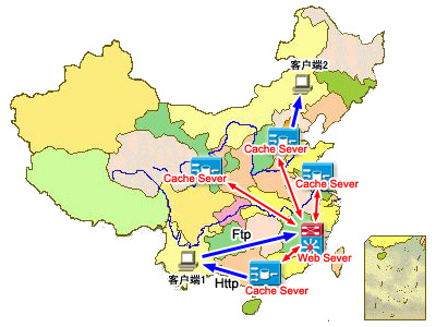 1、上圖的每一個(gè)Cache Server中都有 Web server中已購(gòu)買西部數(shù)碼CDN加速器站點(diǎn)的一個(gè)“克隆版本”,使您的頁(yè)面遍布各地,方便各地瀏覽者光顧。
