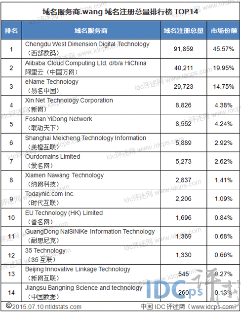IDC評(píng)述網(wǎng)(idcps.com)07月13日?qǐng)?bào)道:根據(jù)ntldstats.com發(fā)布的最新數(shù)據(jù)顯示,截止至2015年7月10日17時(shí)30分,.wang域名注冊(cè)總量十四強(qiáng)排名情況,與上期6月29日相比,無(wú)任何變動(dòng)。其中,西部數(shù)碼較上期凈增18,643個(gè),.wang域名總量升至91,859個(gè),繼續(xù)稱霸.wang域名市場(chǎng)。下面,請(qǐng)看IDC評(píng)述網(wǎng)對(duì)相關(guān)數(shù)據(jù)的整理與分析。